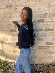 Gorgeous gold and silver embroidered stars on the navy cotton bell sleeved jumper.